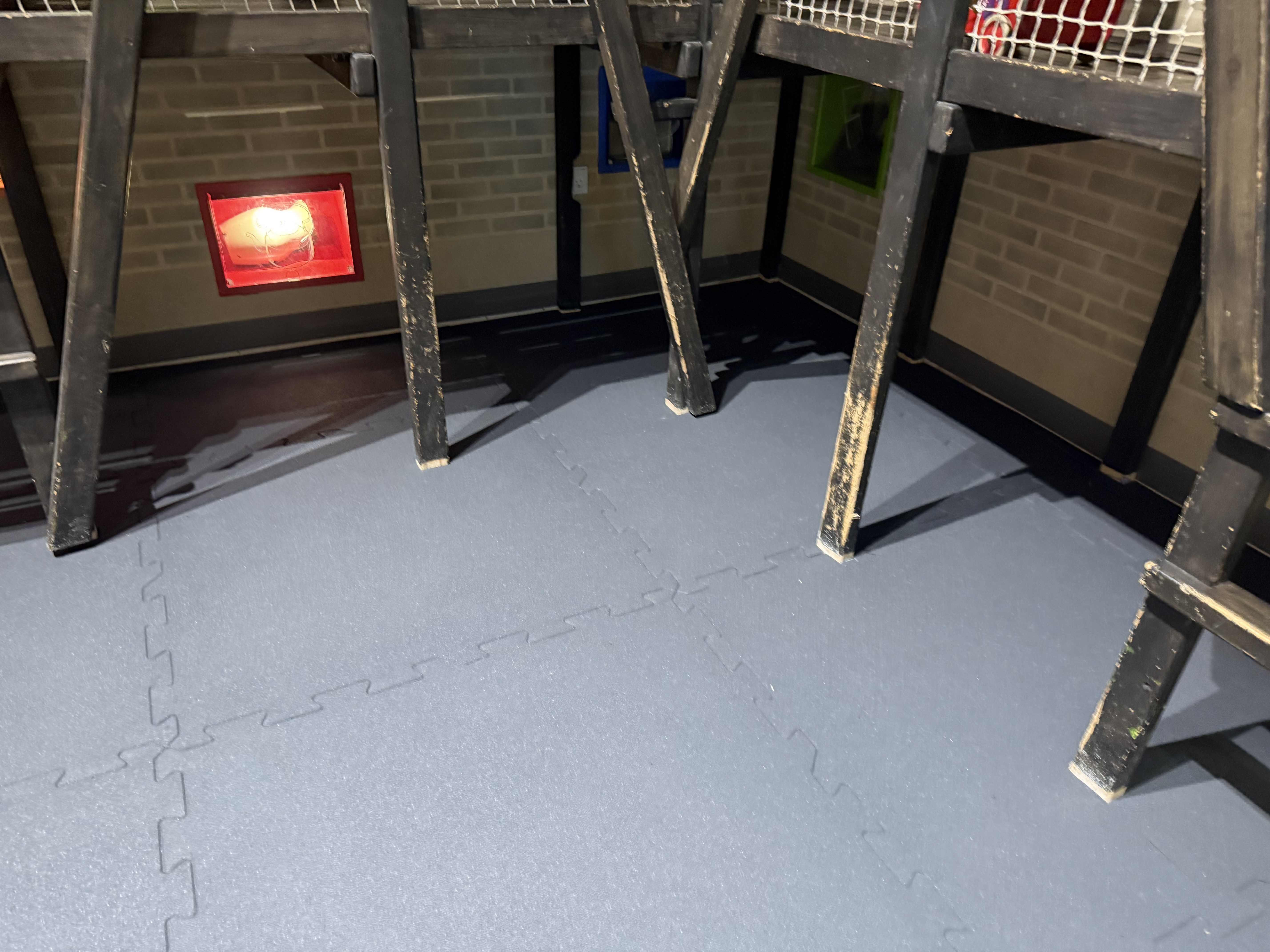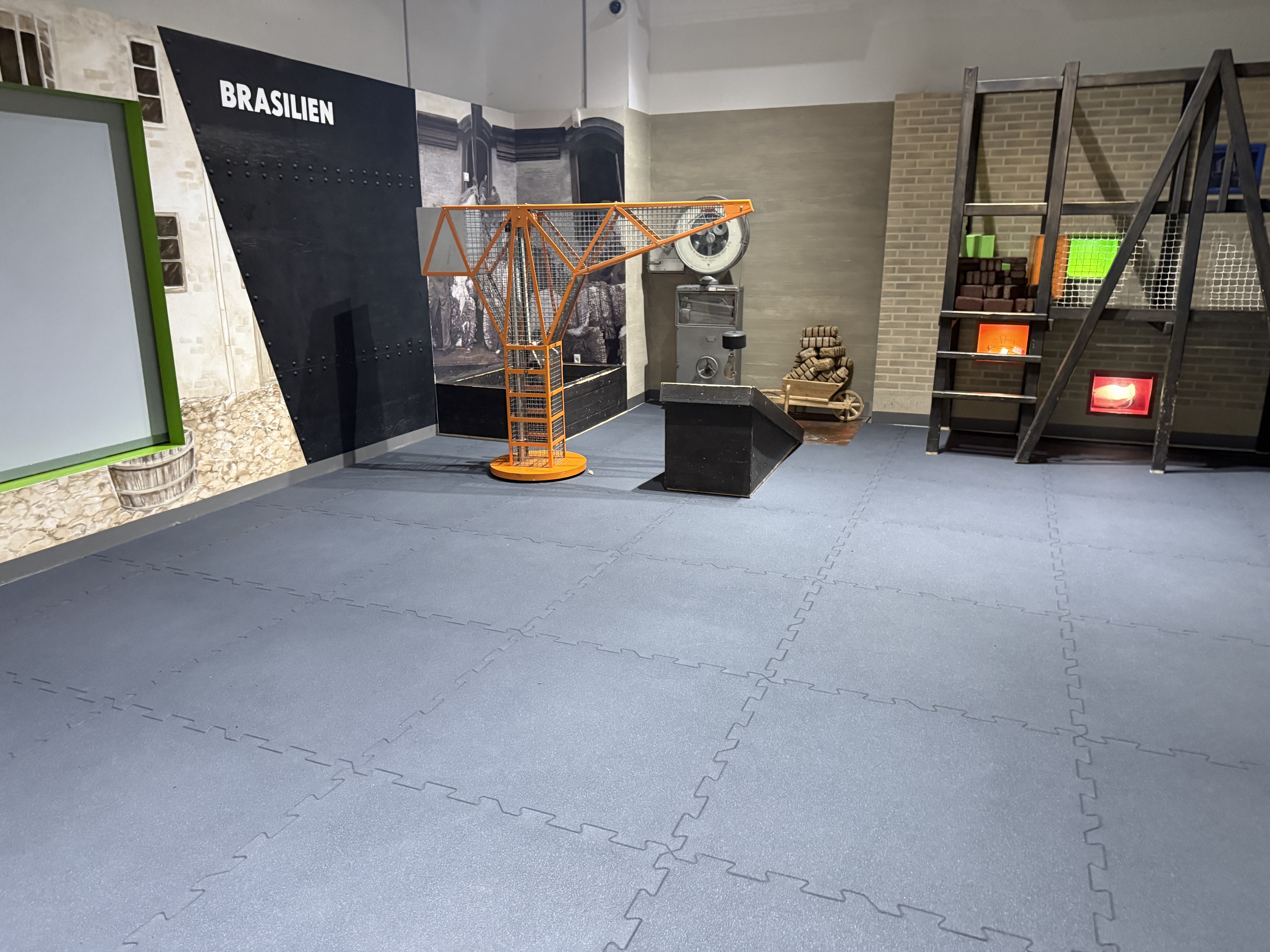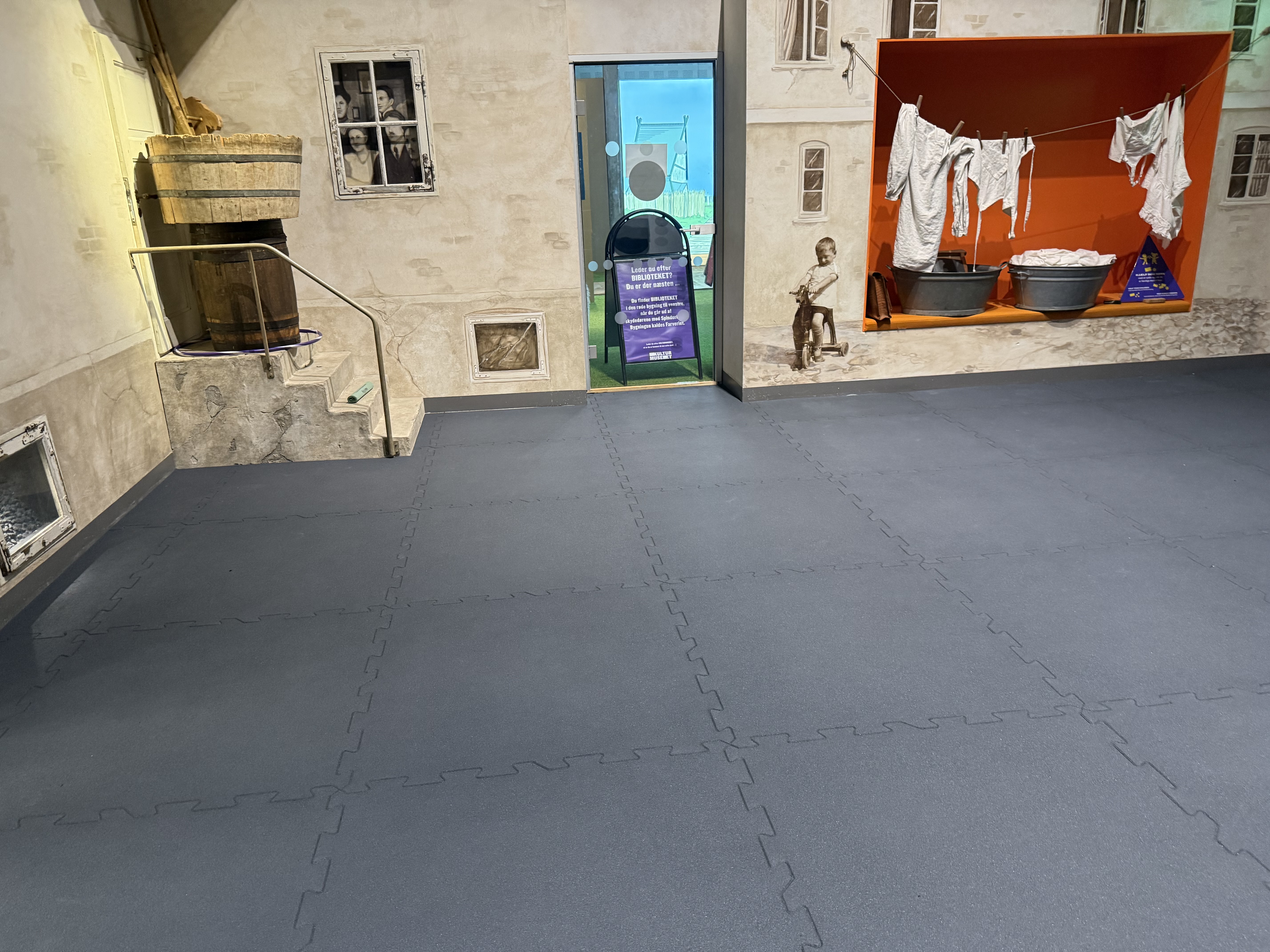 ErgoFloor leverede og installerede PuzzleTile 15 mm gummifliser i grå X-overflade på i alt 66 m². Løsningen er valgt for at give et asfaltlignende look og en robust, sammenhængende flade. PuzzleTile-fliserne låser tæt, giver en stabil overflade og kan lægges med minimal driftsforstyrrelse. Den grå X-overflade er skridsikker, støjdæmpende og let at vedligeholde, hvilket passer til museets brugsscenarie.